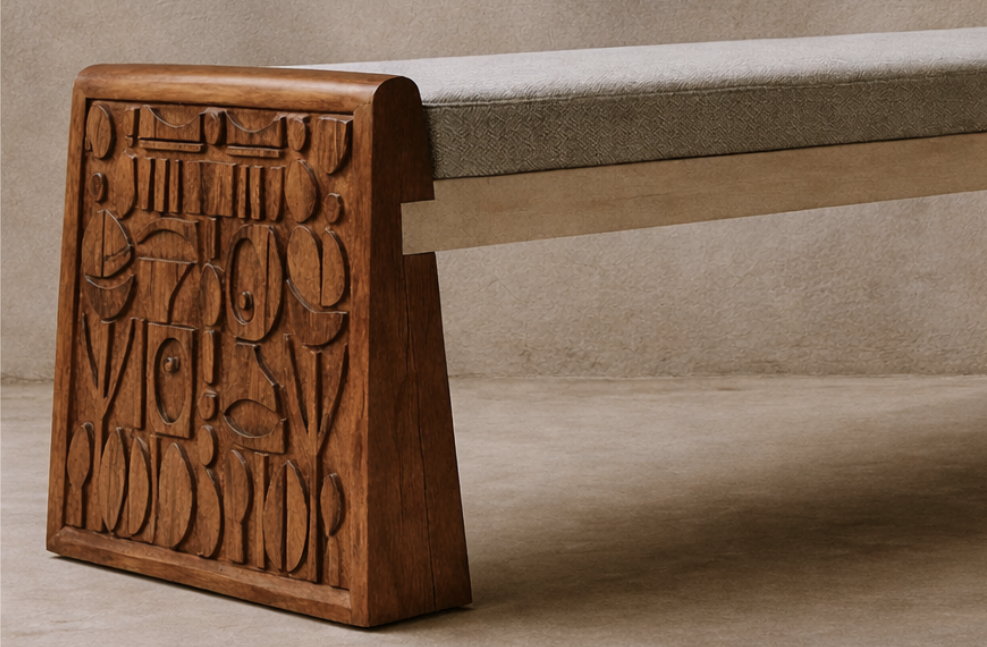 Rooted in Indus Valley motifs, crafted in wood and microcement.