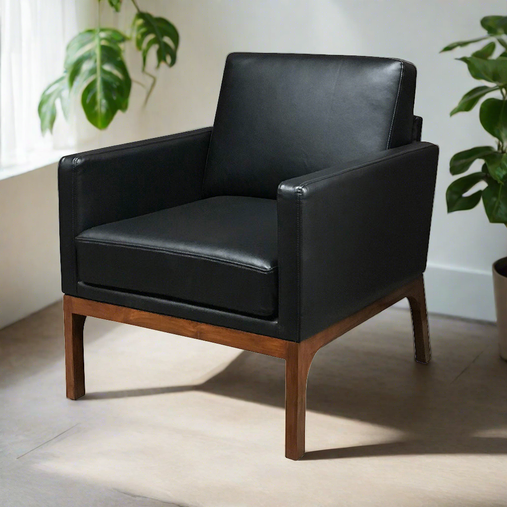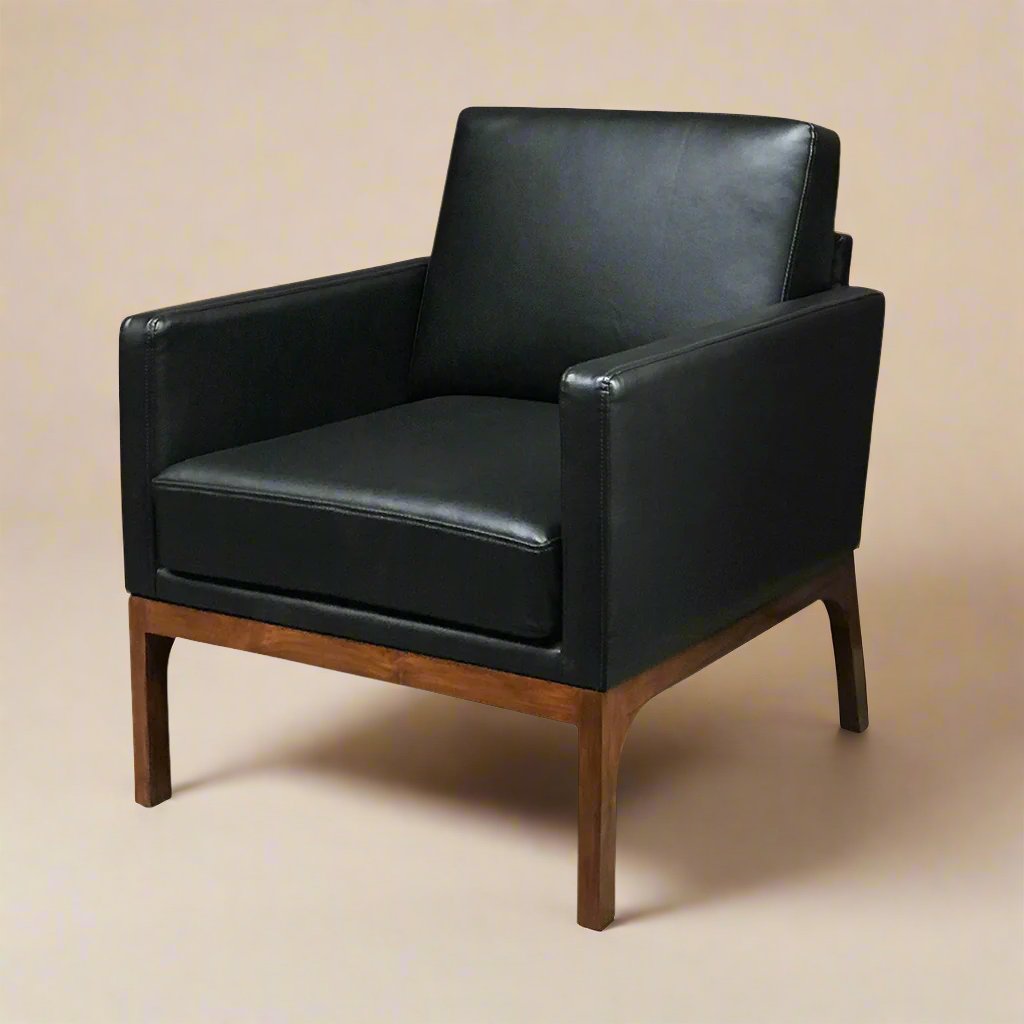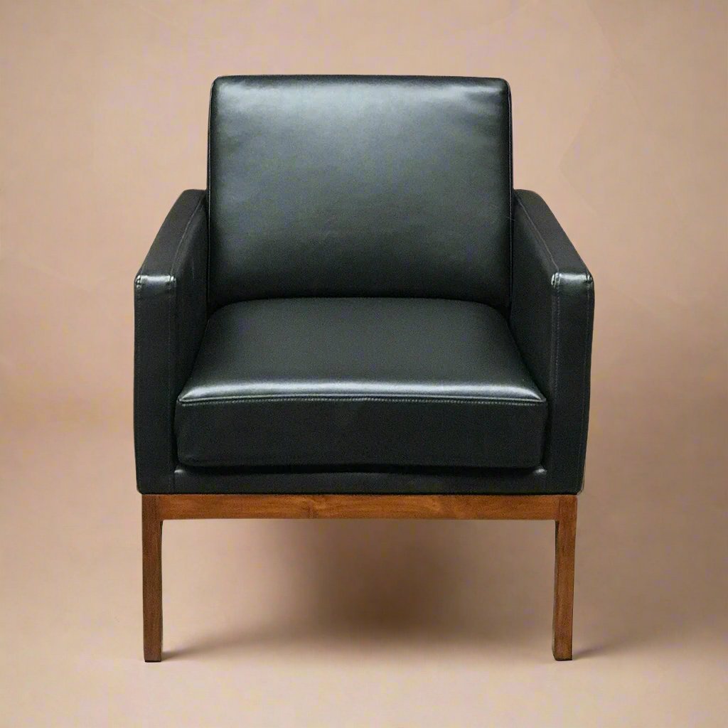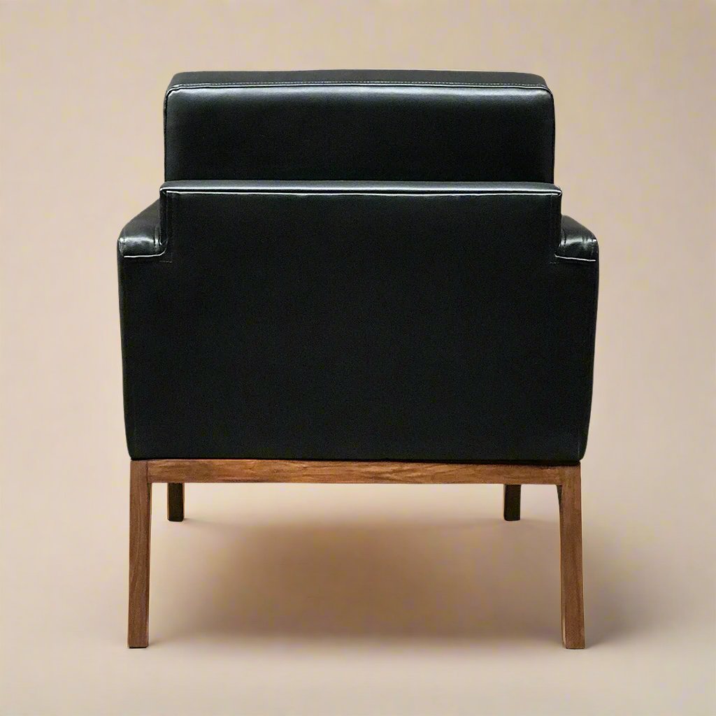 Luxury is back with the Aaron Armchair. Solid colour faux leather combined with the wooden frame for a simply stylish look, making this the perfect modern update to any room. The base frame can be in either black or teak polish.