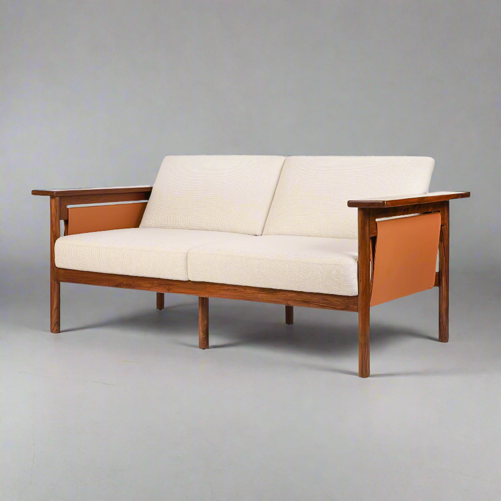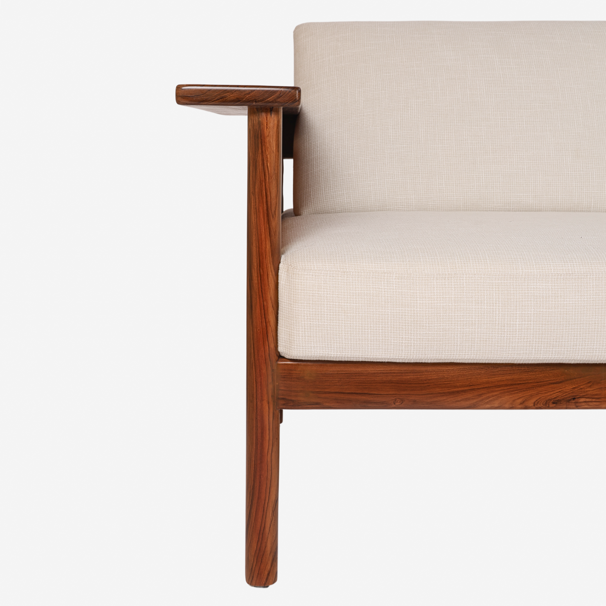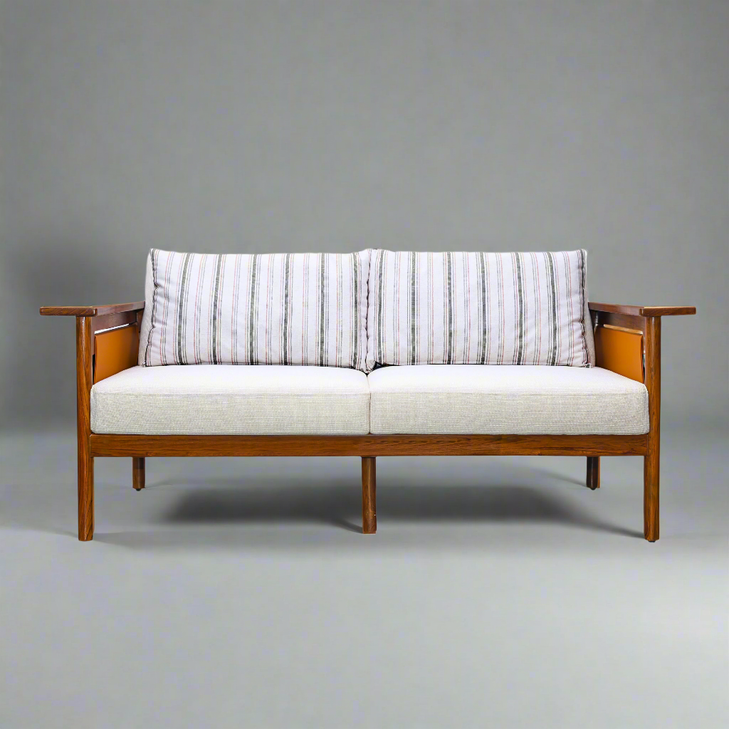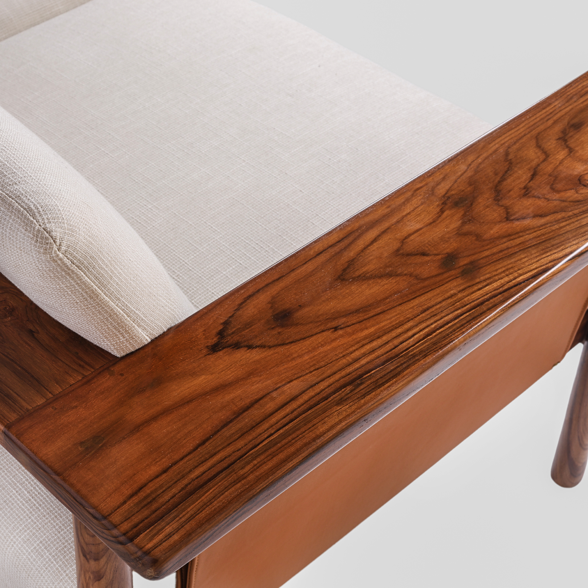 The 'Hibiki' sofa, meaning resonance, represents a perfect balance between form, function, and natural materials. Its design emphasizes clean lines and organic shapes, creating a visually soothing yet practical piece. Upholstered in soft textured fabrics, the sofa offers comfort while reflecting a mindful connection to nature. The frame, crafted from reclaimed Teakwood, highlights a raw, earthy aesthetic that complements the soft cushions. 'Hibiki' embodies the idea of harmony, where every element works together to create a cohesive and peaceful living space, resonating with both modern and traditional design sensibilities.