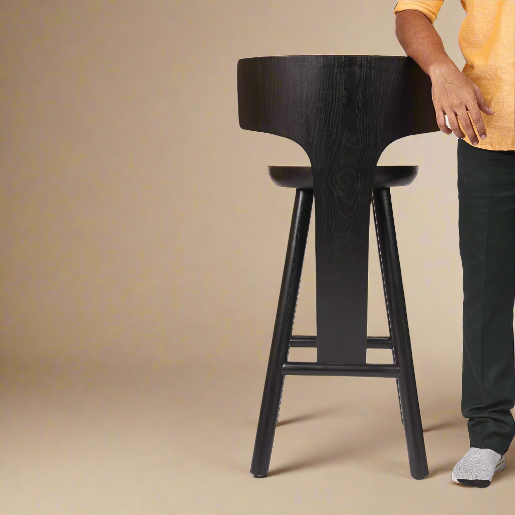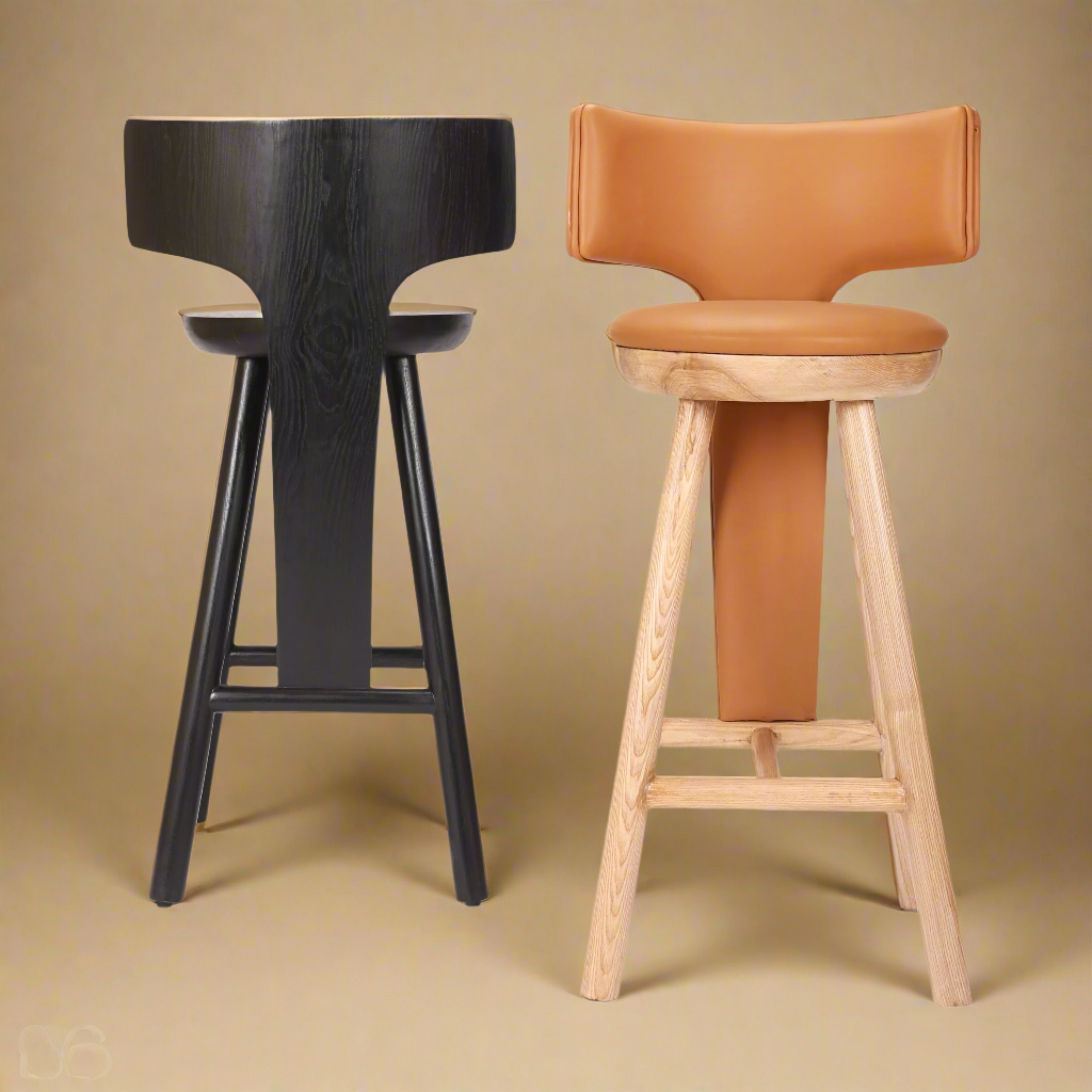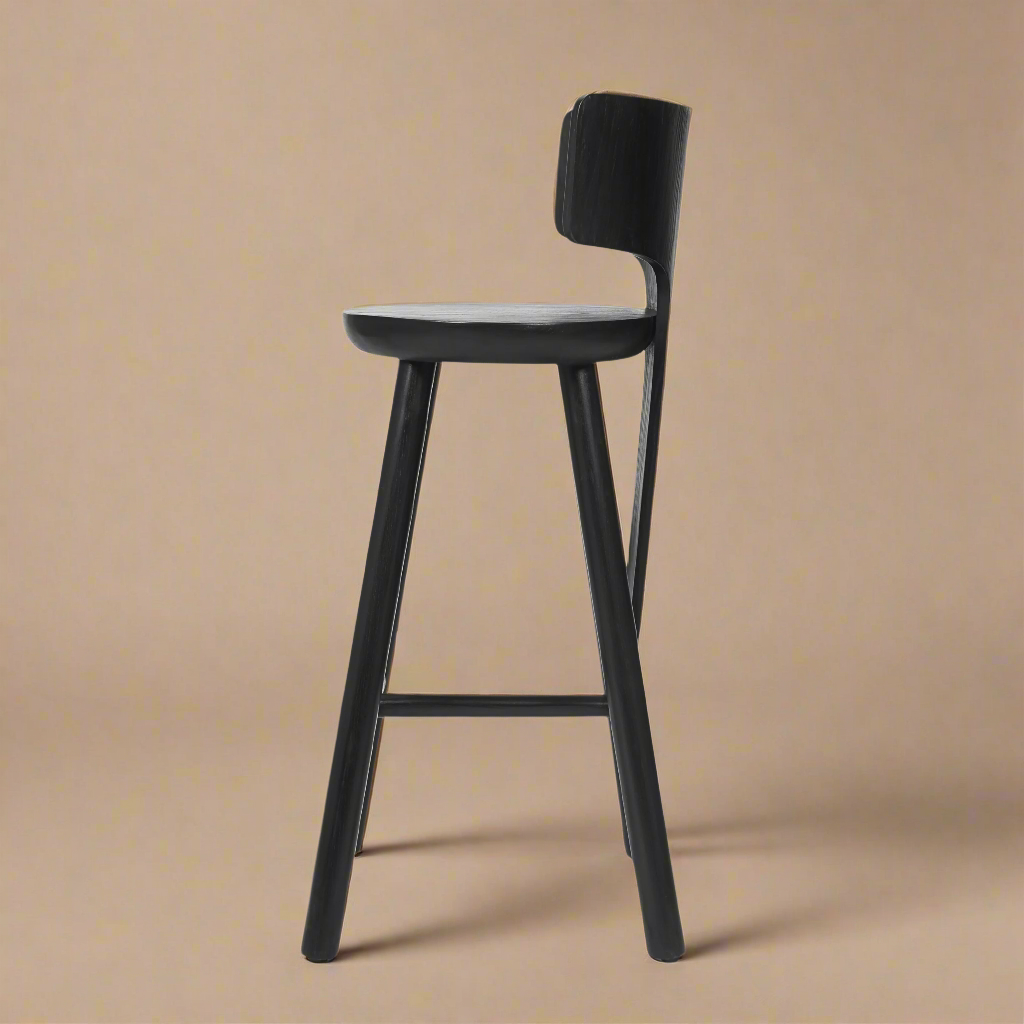 The barstool's silhouette, with its gently curved backrest and seamless integration of the back panel, highlights the balance between aesthetic restraint and comfort, a nod to the "Shibui" principle of understated elegance. The contrasting wood tones and organic materials align with the Japanese appreciation for natural textures and subtle imperfections.