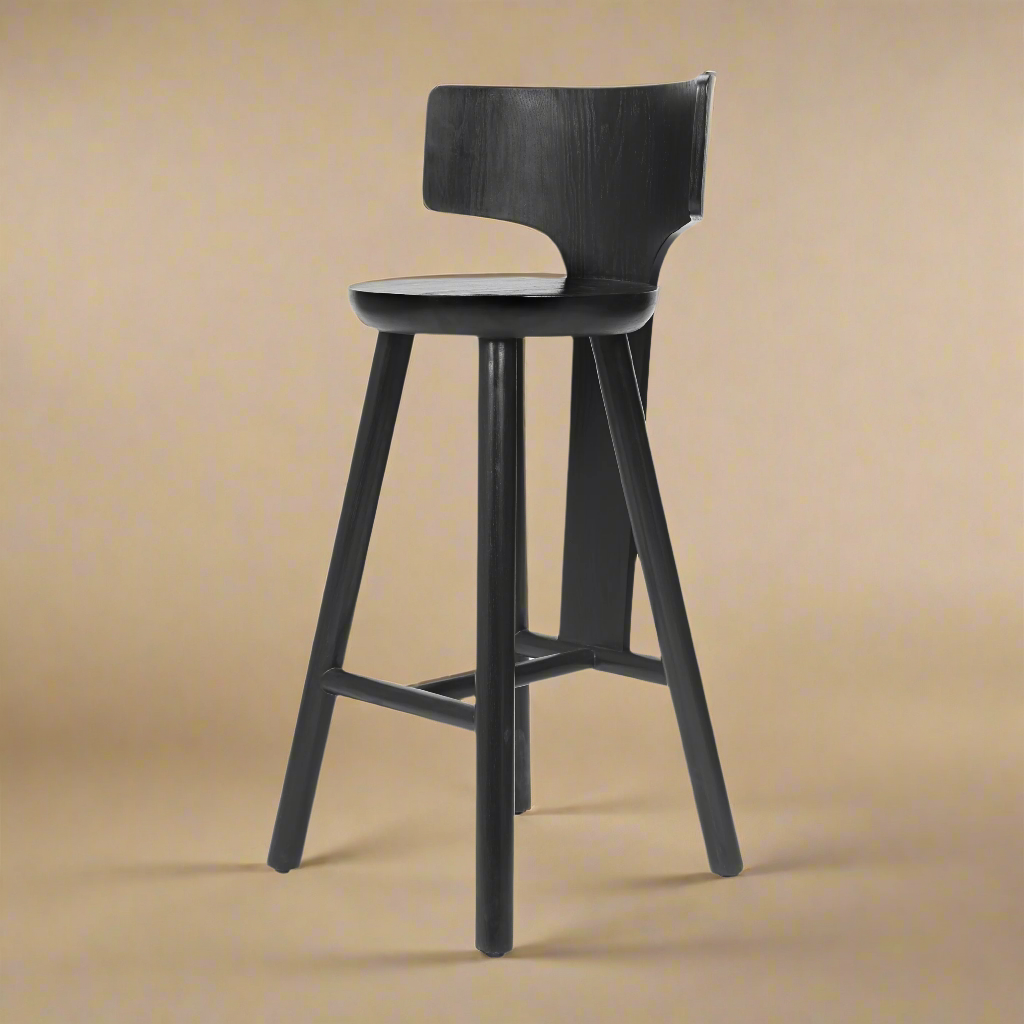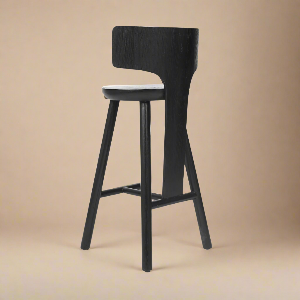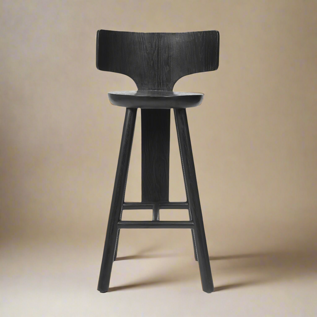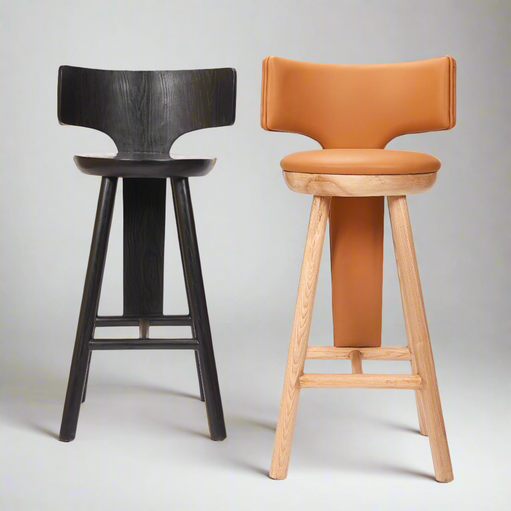 The barstool's silhouette, with its gently curved backrest and seamless integration of the back panel, highlights the balance between aesthetic restraint and comfort, a nod to the "Shibui" principle of understated elegance. The contrasting wood tones and organic materials align with the Japanese appreciation for natural textures and subtle imperfections.