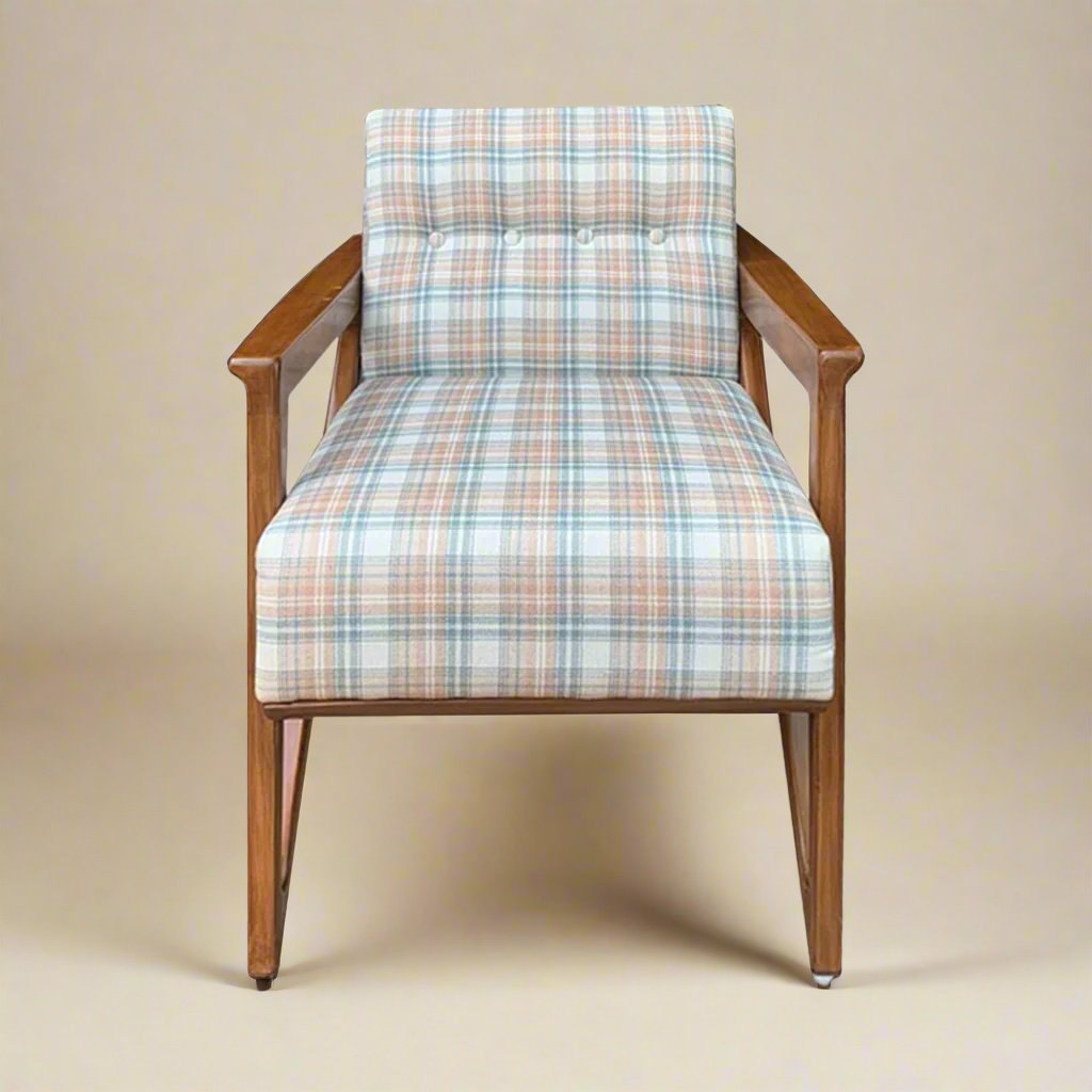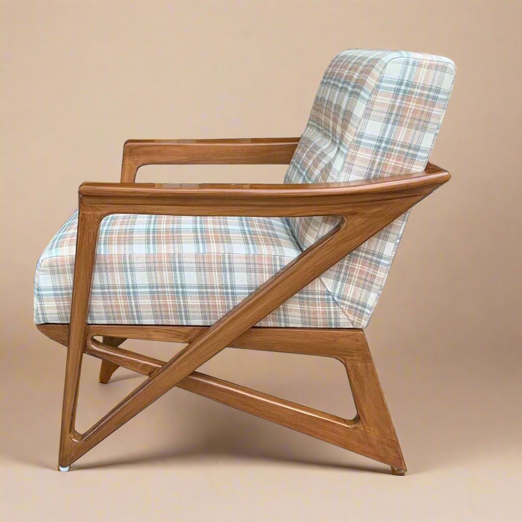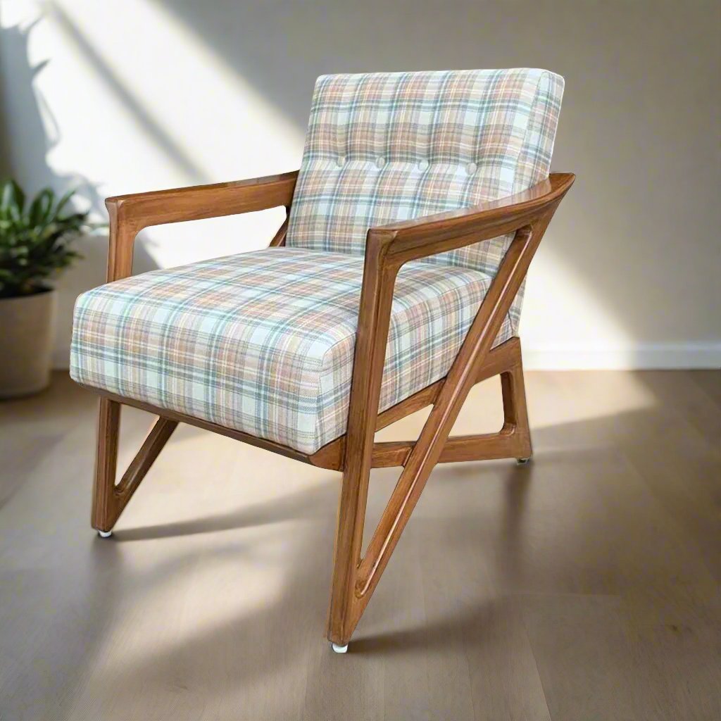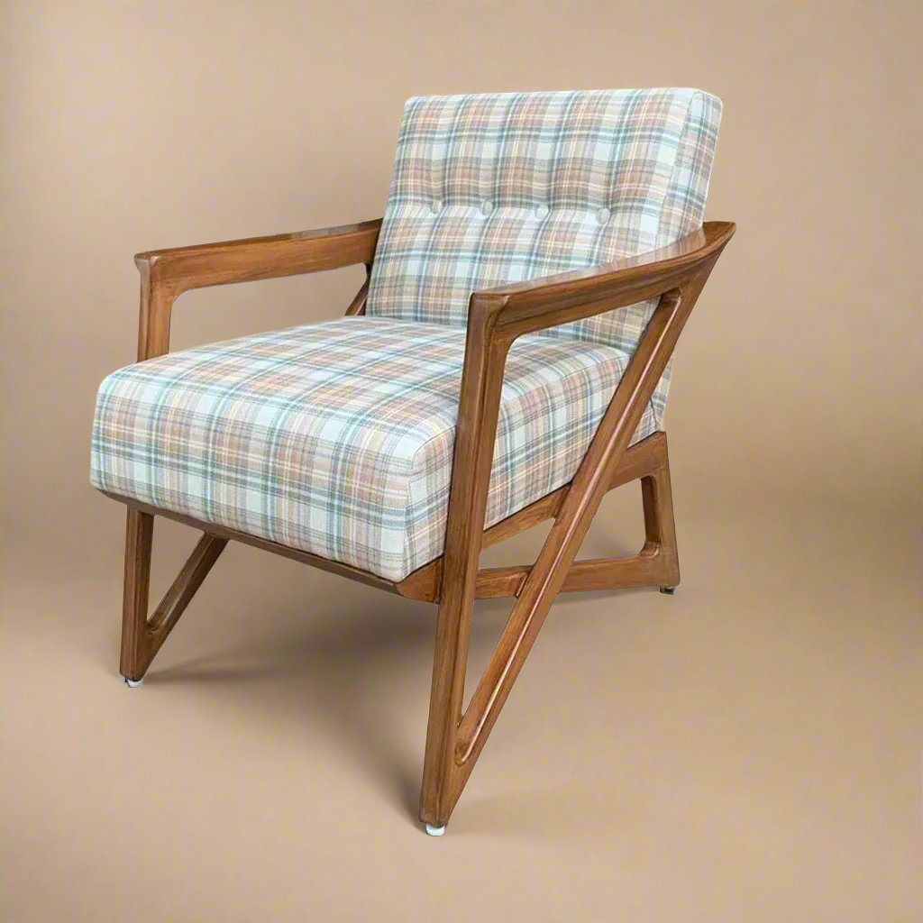 Indulge in the luxurious comfort of Kenneth, the perfect addition to your living room lounge or reading nook. Designed with an angled back, beechwood frame, and cushioned seat, it offers both style and relaxation. The tufting in the back adds a touch of sophistication, while its geometric triangle shape and comfortable armrest make it a statement piece for any midcentury modern aesthetic. Sit back, relax, and elevate your space with Kenneth.