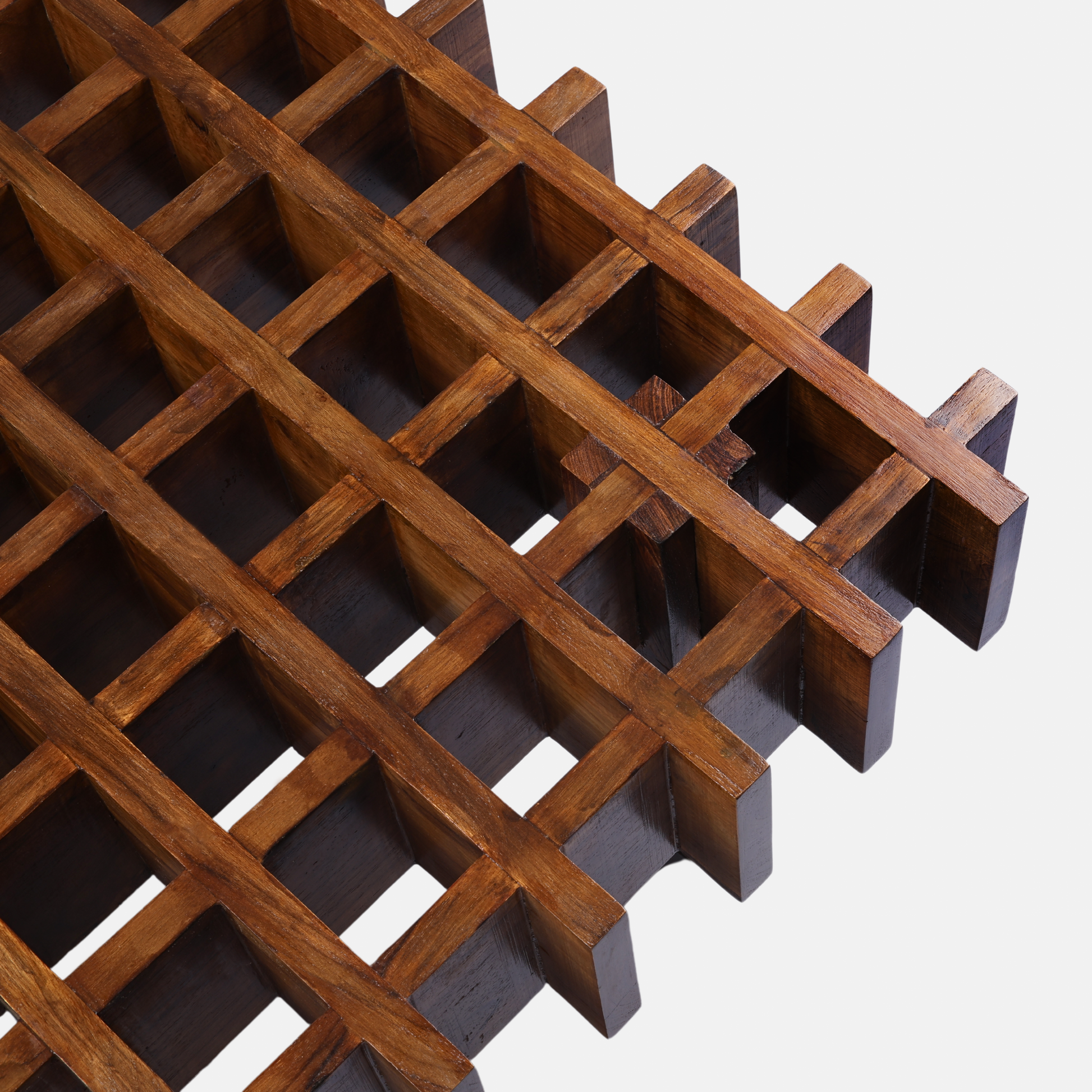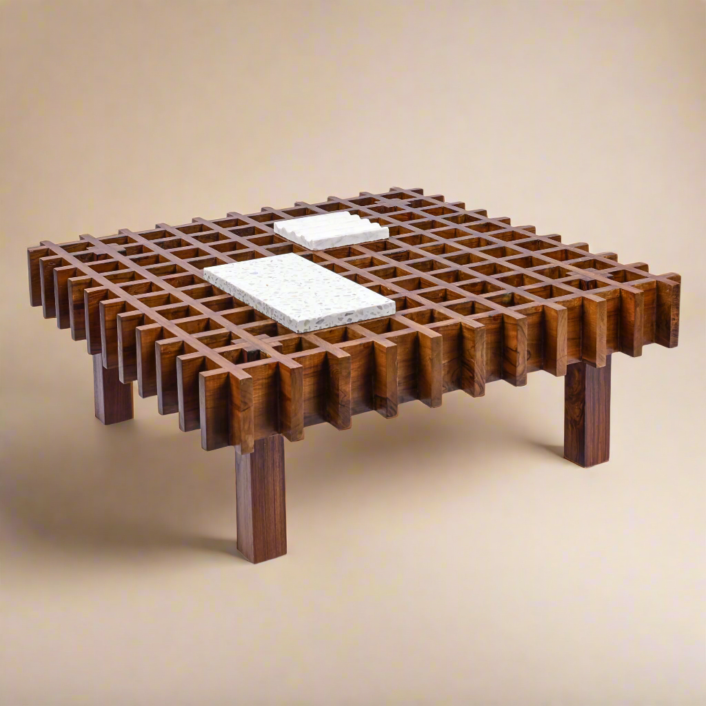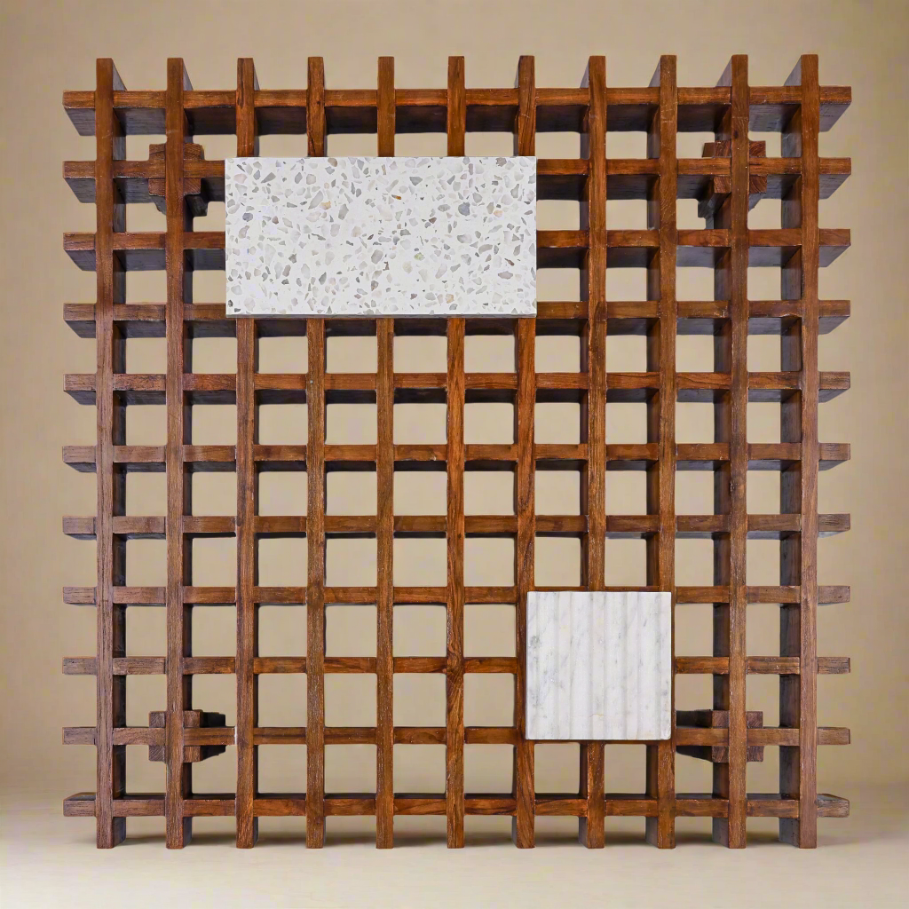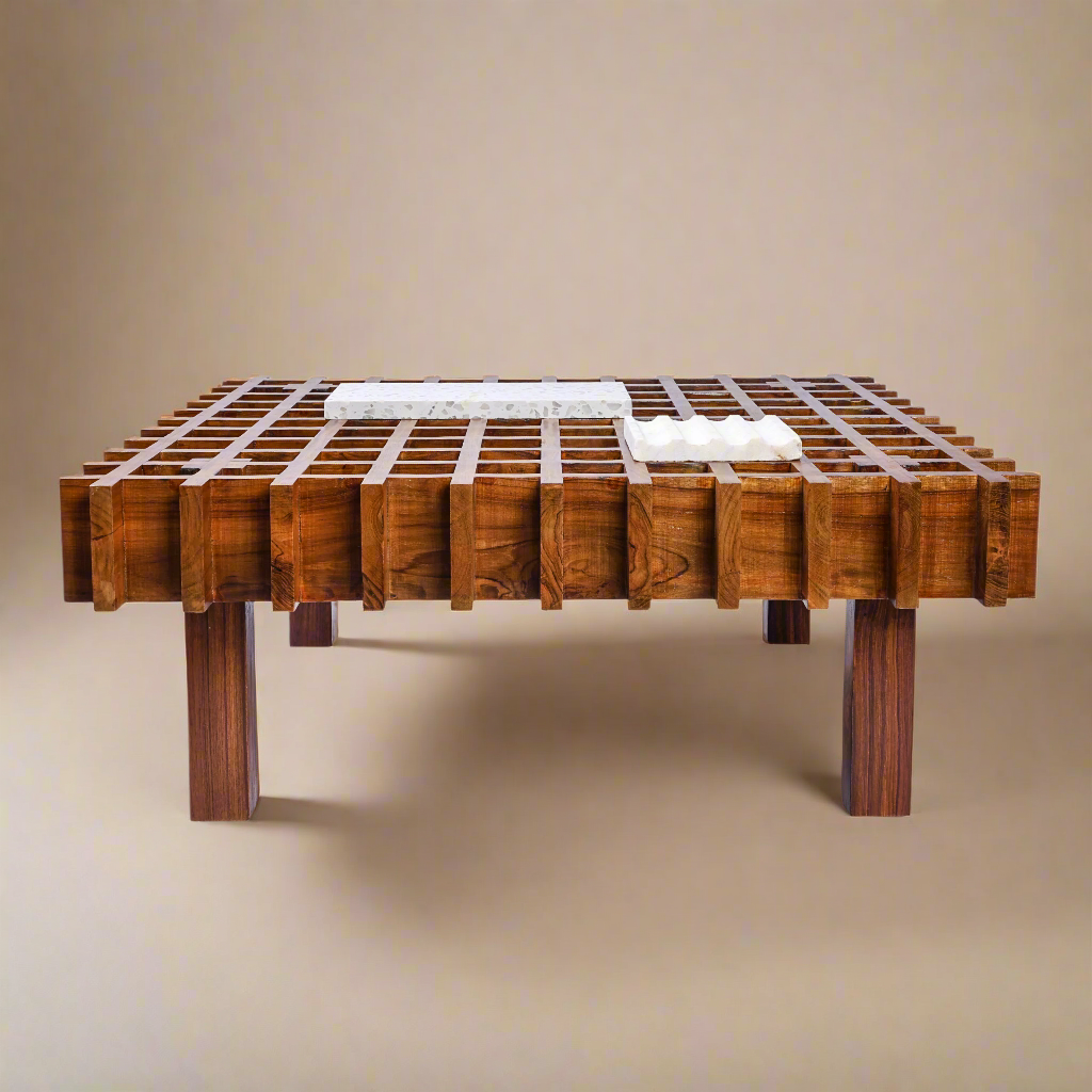 Designed with handcrafted precision, the Koshi Grid Table highlights the beauty of natural materials, embodying a balance between strength and subtlety. Its refined form emphasizes the use of space, light, and shadow, much like the architectural elements that inspired it. A statement center piece, the Koshi Grid Table offers a timeless, sophisticated appeal that brings warmth and simplicity into any setting. Note: Marble pieces are not included.