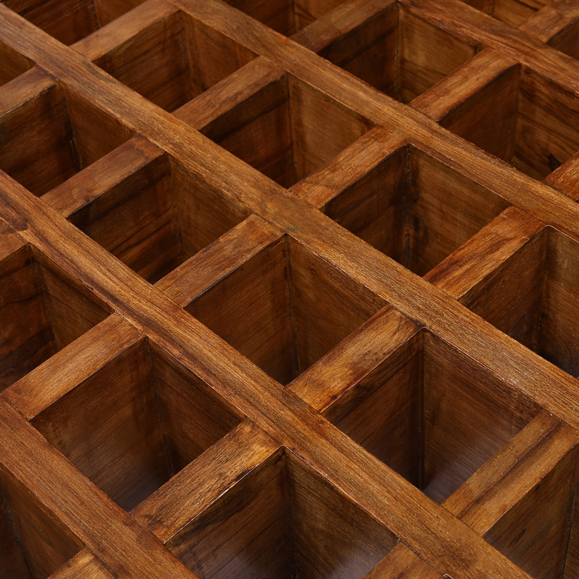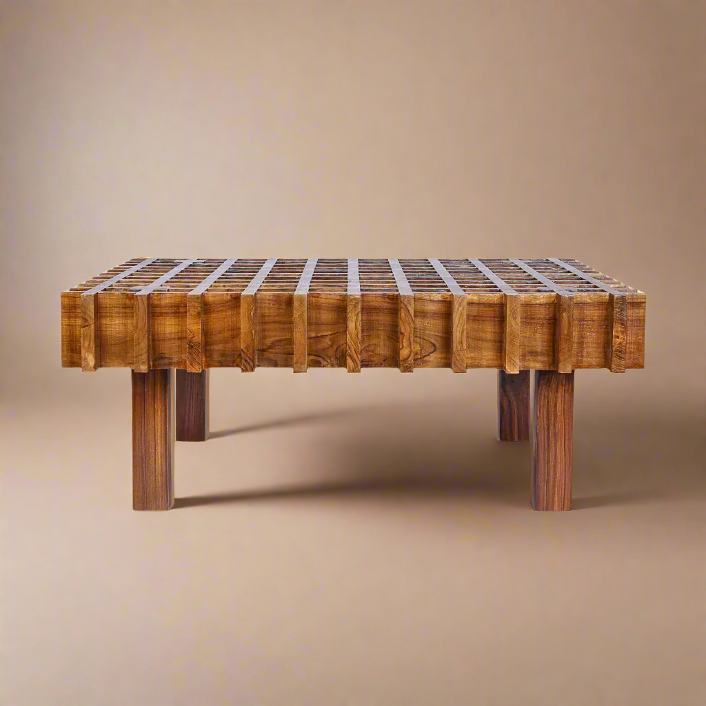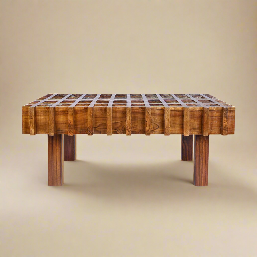 Designed with handcrafted precision, the Koshi Grid Table highlights the beauty of natural materials, embodying a balance between strength and subtlety. Its refined form emphasizes the use of space, light, and shadow, much like the architectural elements that inspired it. A statement center piece, the Koshi Grid Table offers a timeless, sophisticated appeal that brings warmth and simplicity into any setting. Note: Marble pieces are not included.